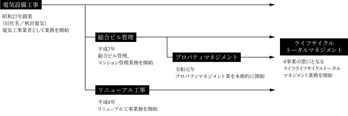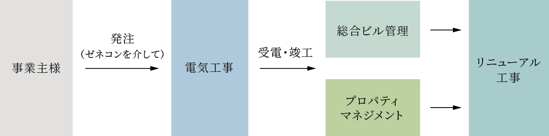 電気設備工事、総合ビル管理、リニューアル工事、プロパティマネジメント。